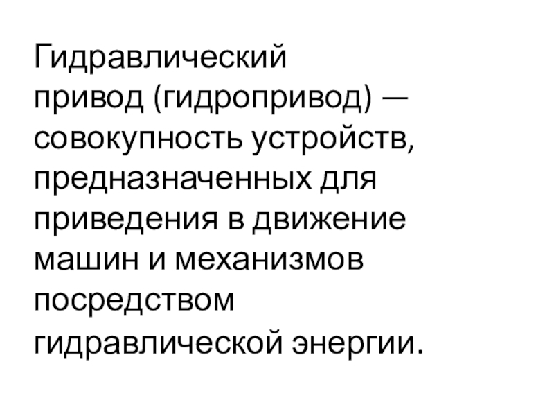Слайд 3Гидравлический привод (гидропривод) — совокупность устройств, предназначенных для приведения в движение машин и