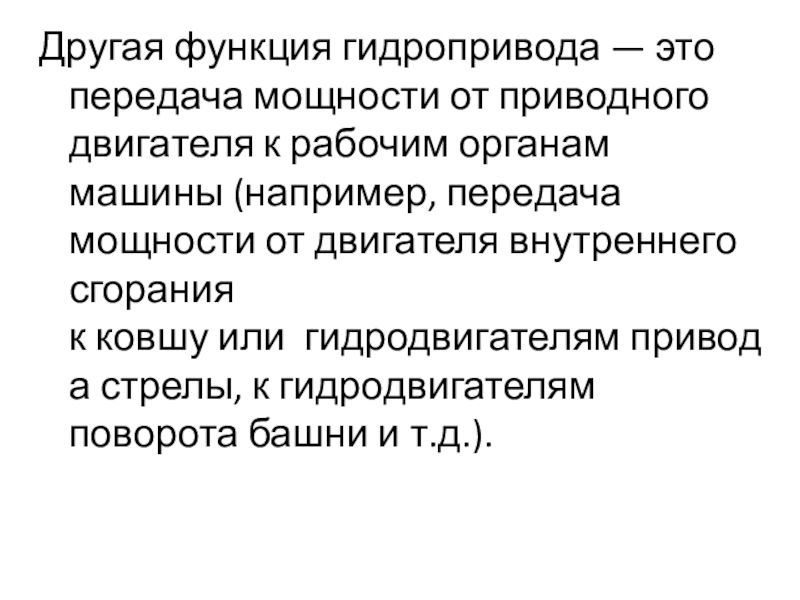 Слайд 5Другая функция гидропривода — это передача мощности от приводного двигателя к