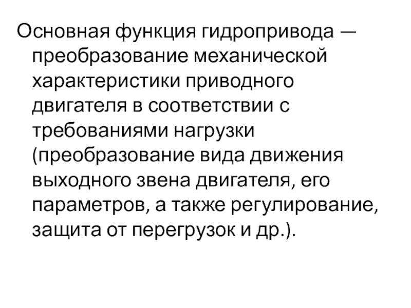 Слайд 4Основная функция гидропривода — преобразование механической характеристики приводного двигателя в соответствии