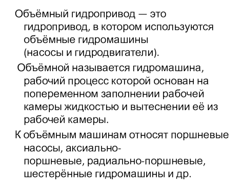 Слайд 10Объёмный гидропривод — это гидропривод, в котором используются объёмные гидромашины (насосы и гидродвигатели).
