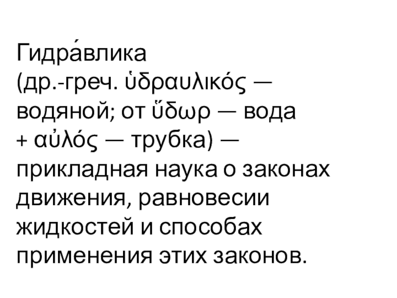 Слайд 2 Гидра́влика  (др.-греч. ὑδραυλικός — водяной; от ὕδωρ — вода + αὐλός — трубка) — прикладная наука о законах