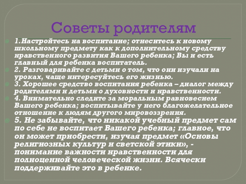 5. Не забывайте, что никакой учебный предмет сам по себе не воспитает Вашего ребенка; главное, что он может приобрести, изучая предмет «Основы религиозных культур и светской этики», - понимание важности нравственности для полноценной человеческой жизни. Всячески поддерживайте это в ребенке.