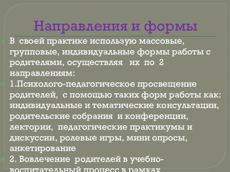 1.Психолого-педагогическое просвещение родителей, с помощью таких форм работы как: индивидуальные и тематические консультации, родительские собрания и конференции, лектории, педагогические практикумы и дискуссии, ролевые игры, мини опросы, анкетирование