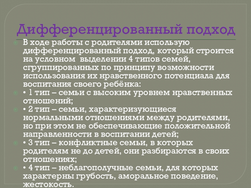 В ходе работы с родителями использую дифференцированный подход, который строится