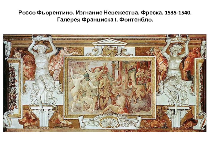 Слайд 24Россо Фьорентино. Изгнание Невежества. Фреска. 1535-1540. Галерея Франциска I. Фонтенбло.