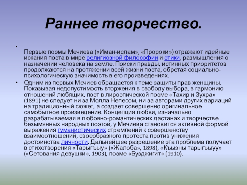 Первые поэмы Мечиева («Иман-ислам», «Пророки») отражают идейные искания поэта в