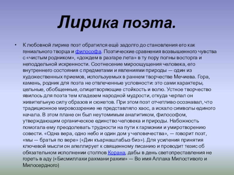 как гениального творца и философа. Поэтические сравнения возвышенного чувства с «чистым родником», «дождем в разгаре лета» в ту пору полны восторга и неподдельной искренности. Соотнесение мироощущения человека, его внутреннего состояния с предметами и явлениями природы — один из художественных приемов, используемых в раннем творчестве Мечиева. Гора, камень, родник для поэта не отвлеченные условности: это сами характеры, цельные, обобщенные, олицетворяющие стойкость и волю. Устное творчество явилось для поэта тем кладезем народной мудрости, откуда черпал он живительную силу образов и сюжетов. При этом поэт отчетливо осознавал, что традиционное мировоззрение не представляло хаос, а искало символы единого начала. В этом плане он был неутомимым аналитиком, философом, утверждающим органическое единство человека и природы. Набожность помогала ему преодолевать трудности на пути к гармонии и умиротворению совести. «Одна вера, одно небо и один дом у человечества», — говорит поэт, «мы — братья по вере» («Дин къарнашлабыз биз»). Для усиления принятия ключевой мысли он апеллирует к священному писанию и проводит тезис об обязательном исполнении столпов Корана, дабы в день светопреставления не гореть в аду («Бисмиллахи рахмани рахим» — Во имя Аллаха Милостивого и Милосердного)