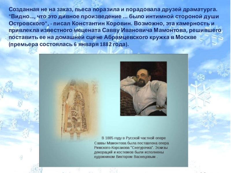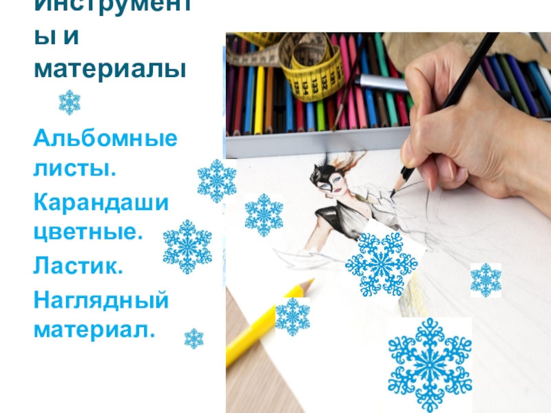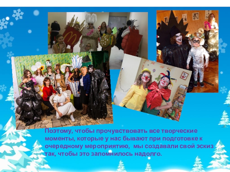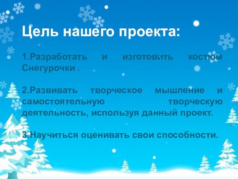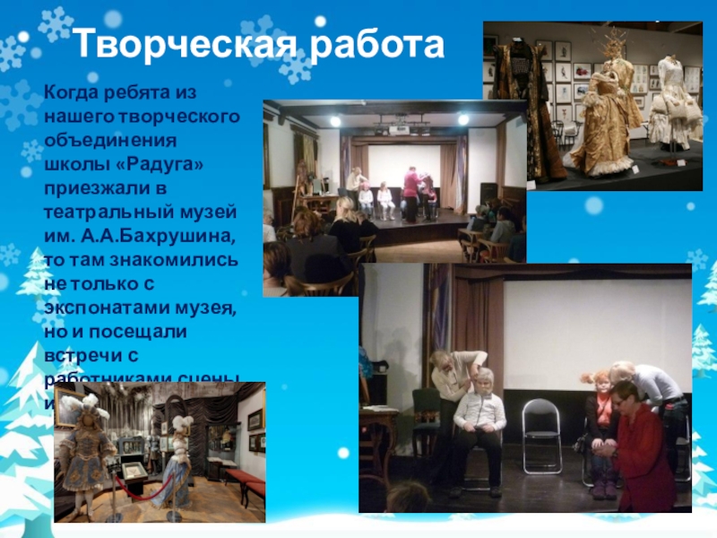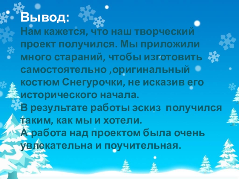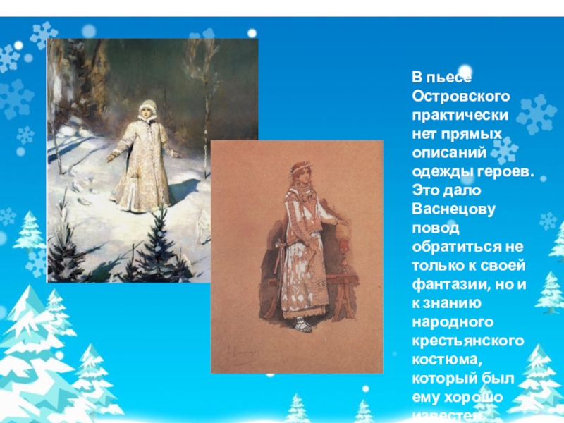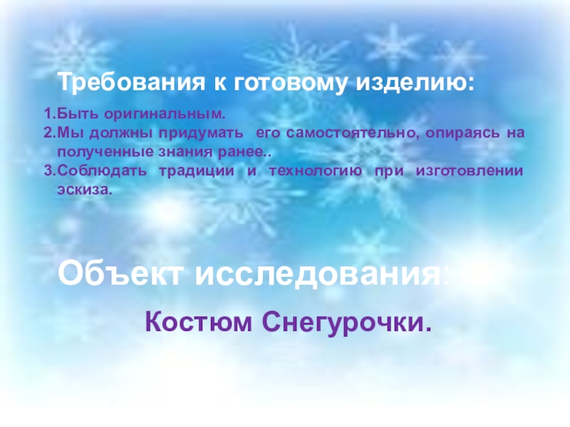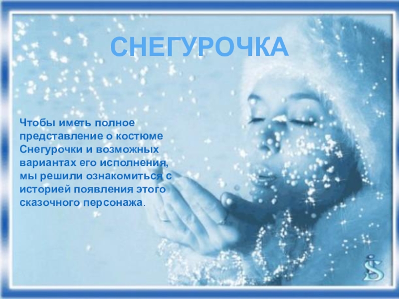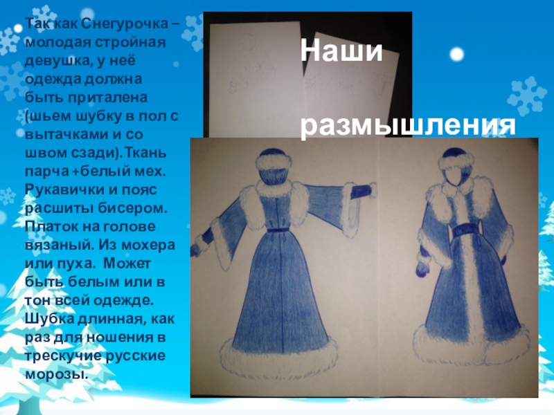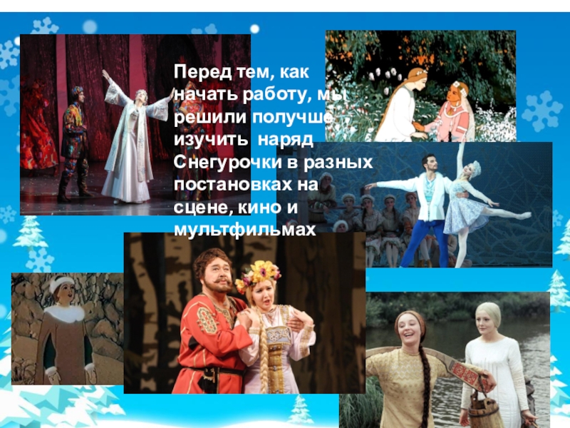 Наша задача состоит в том, чтобы создать на основе полученных знаний во время посещения театрального музея им. А.А.Бахрушина, читая произведение А.Н.Островского, пользуясь интернетом, вспоминая конструирование моделей на занятиях в творческом объединении школы «Радуга»,эскиз костюма Снегурочки. Театральный костюм, на протяжении всей истории человечества, является произведением искусств. Именно искусств. Потому, что в процессе создания костюма, принимают участие множество мастеров, разной направленности и разных видов деятельности.