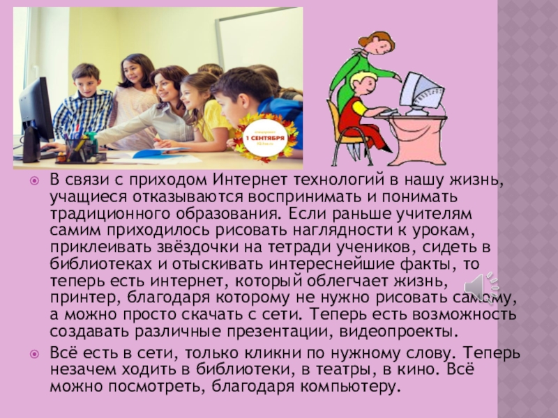 воспринимать и понимать традиционного образования. Если раньше учителям самим приходилось рисовать наглядности к урокам, приклеивать звёздочки на тетради учеников, сидеть в библиотеках и отыскивать интереснейшие факты, то теперь есть интернет, который облегчает жизнь, принтер, благодаря которому не нужно рисовать самому, а можно просто скачать с сети. Теперь есть возможность создавать различные презентации, видеопроекты.