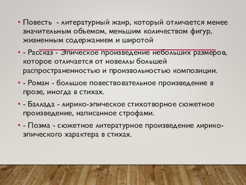 Слайд 59Повесть - литературный жанр, который отличается менее значительным объемом, меньшим количеством
