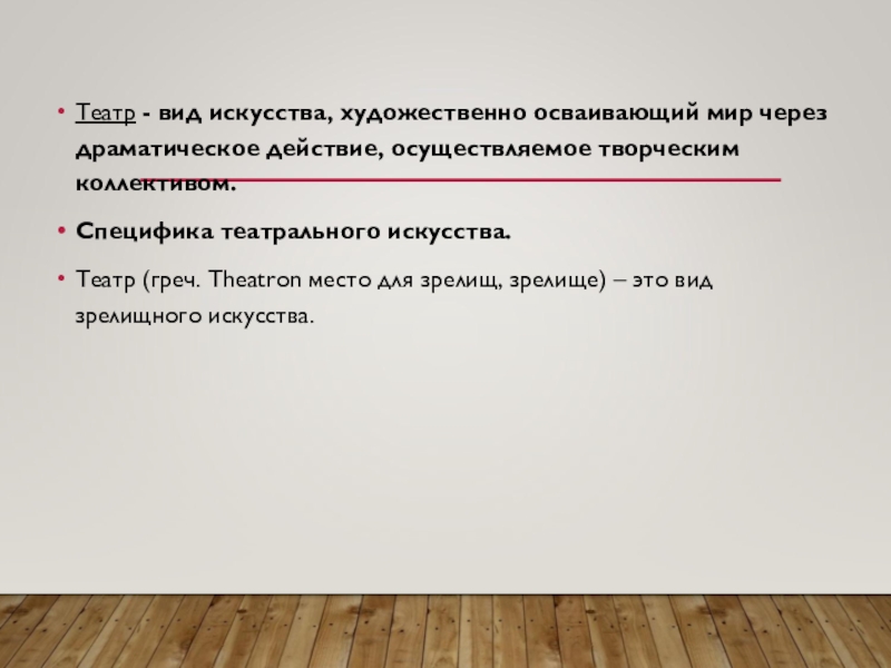 Театр (греч. Theatron место для зрелищ, зрелище) – это вид зрелищного искусства.