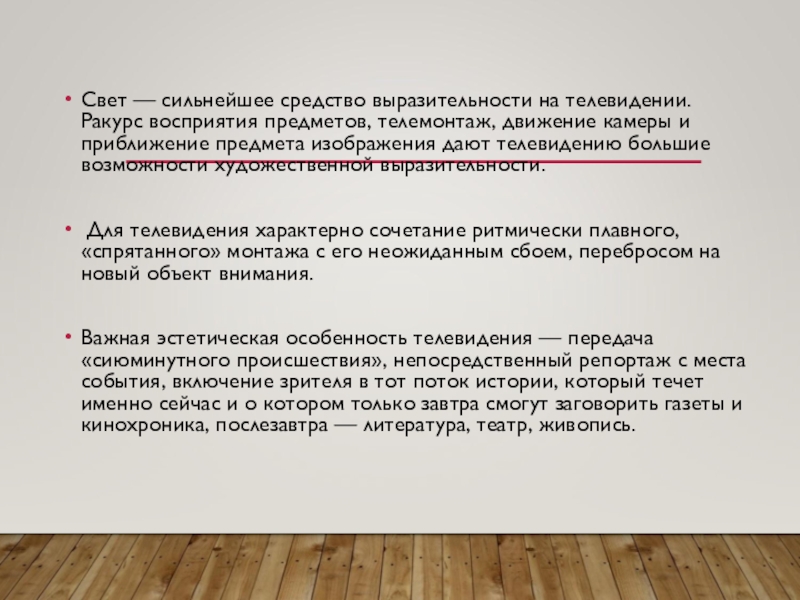 Важная эстетическая особенность телевидения — передача «сиюминутного происшествия», непосредственный репортаж с места события, включение зрителя в тот поток истории, который течет именно сейчас и о котором только завтра смогут заговорить газеты и кинохроника, послезавтра — литература, театр, живопись.