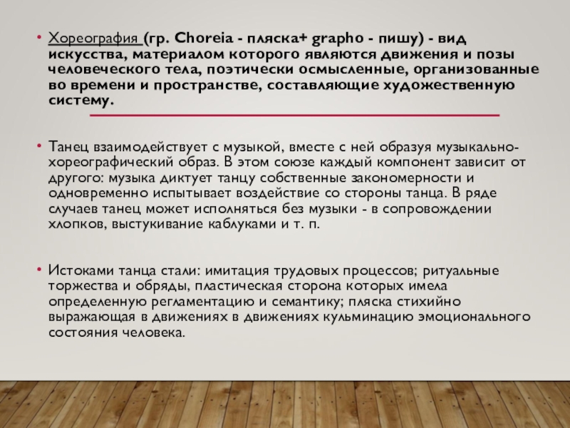 Истоками танца стали: имитация трудовых процессов; ритуальные торжества и обряды, пластическая сторона которых имела определенную регламентацию и семантику; пляска стихийно выражающая в движениях в движениях кульминацию эмоционального состояния человека.