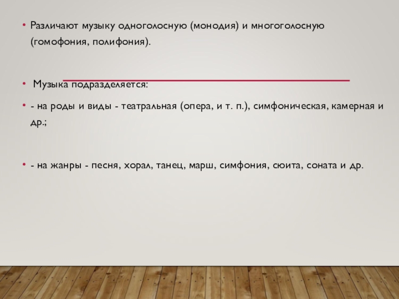 Слайд 61Различают музыку одноголосную (монодия) и многоголосную (гомофония, полифония).