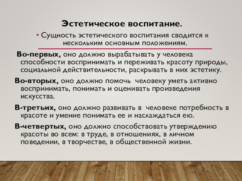 Сущность эстетического воспитания сводится к нескольким основным положениям.