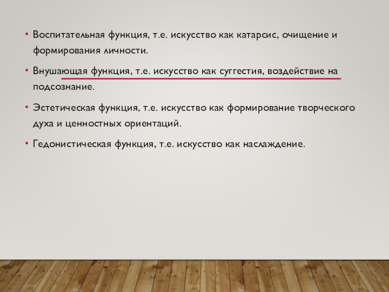 Духовно-культурная (выработка идеалов, личного вкуса, вынесение вкусовых оценок, суждений)
