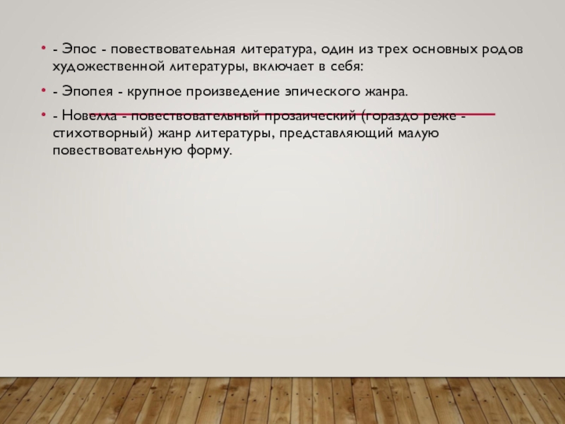 - Рассказ - Эпическое произведение небольших размеров, которое отличается от новеллы большей распространенностью и произвольностью композиции.
