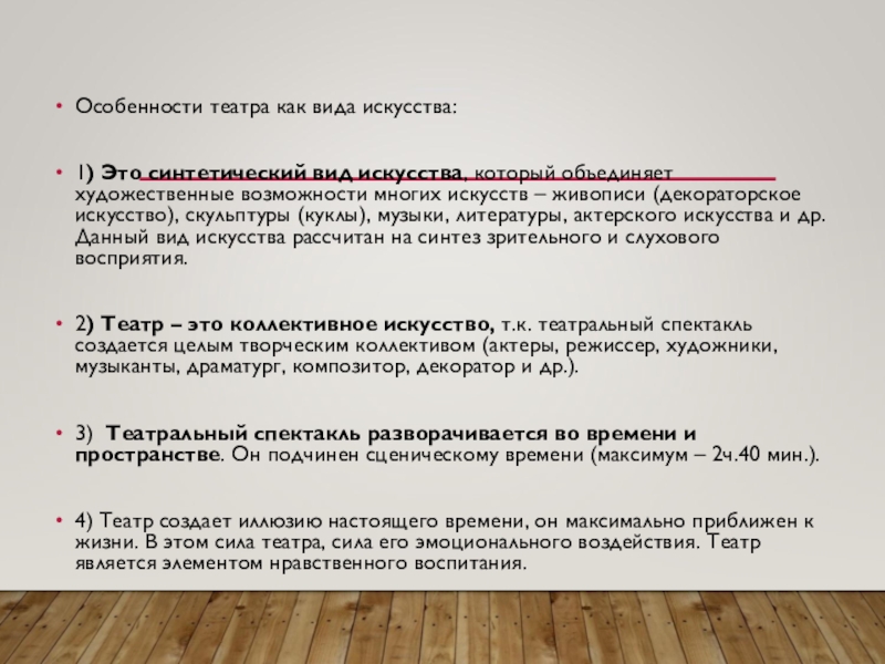 4) Театр создает иллюзию настоящего времени, он максимально приближен к жизни. В этом сила театра, сила его эмоционального воздействия. Театр является элементом нравственного воспитания.
