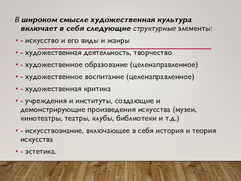 Слайд 16В широком смысле художественная культура включает в себя следующие структурные элементы: