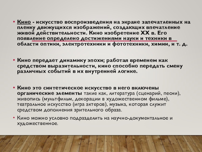 создающих впечатление живой действительности. Кино изобретение XX в. Его появление определено достижениями науки и техники в области оптики, электротехники и фототехники, химии, и т. д.