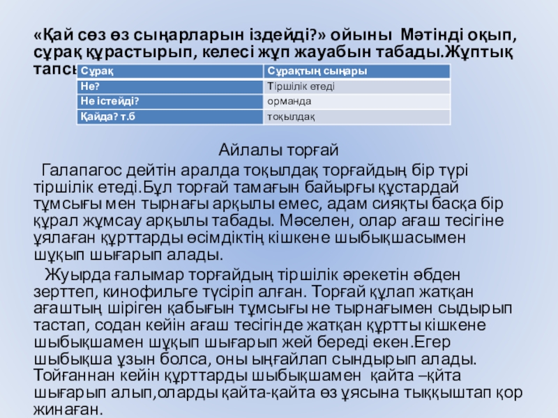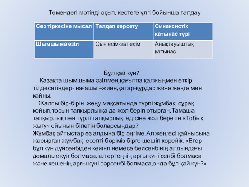 Слайд 5Төмендегі мәтінді оқып, кестеге үлгі бойынша талдау