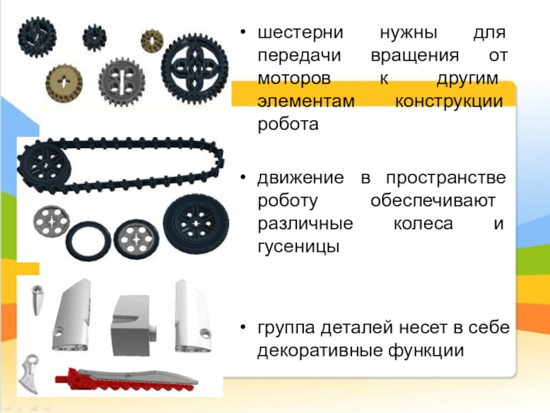Слайд 6шестерни нужны для передачи вращения от моторов к другим элементам конструкции