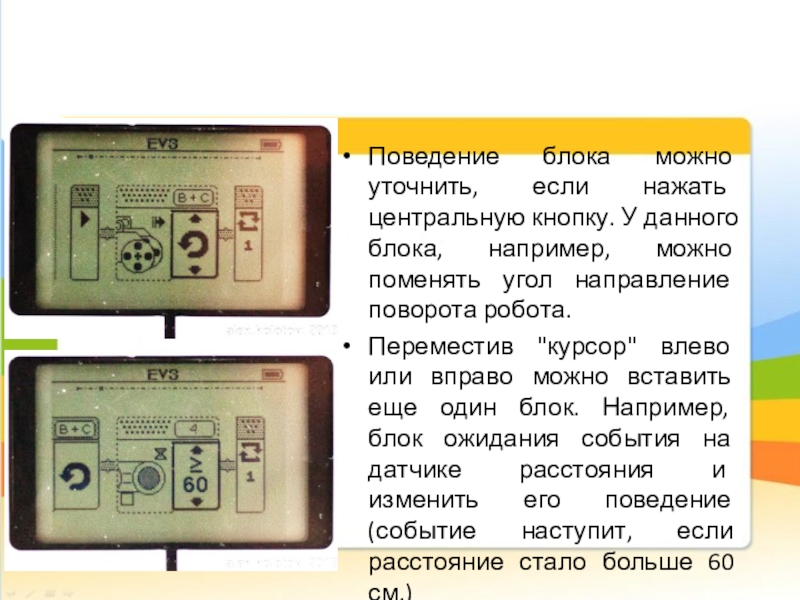 Переместив "курсор" влево или вправо можно вставить еще один блок. Например, блок ожидания события на датчике расстояния и изменить его поведение (событие наступит, если расстояние стало больше 60 см.)