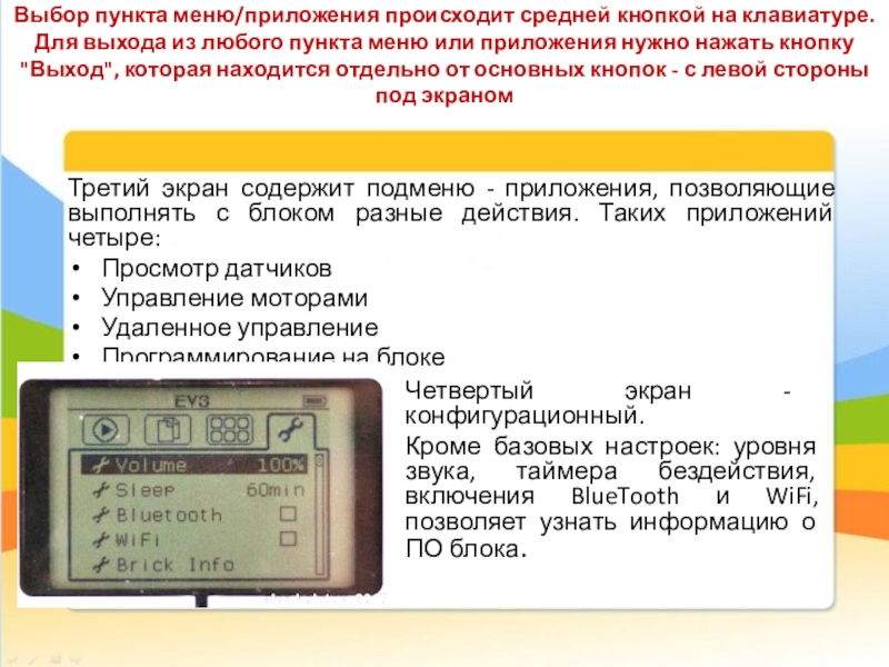 Слайд 14Третий экран содержит подменю - приложения, позволяющие выполнять с блоком разные