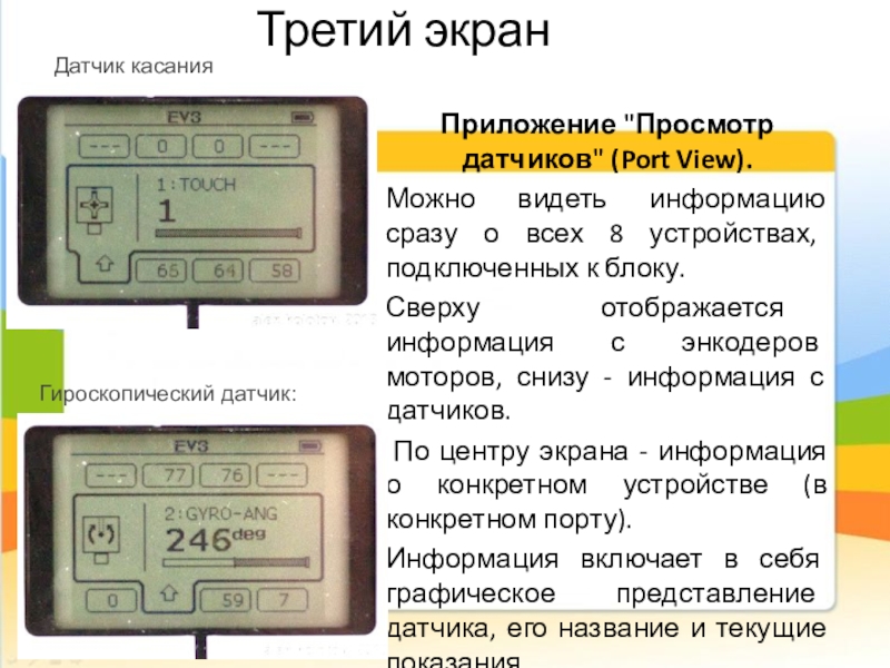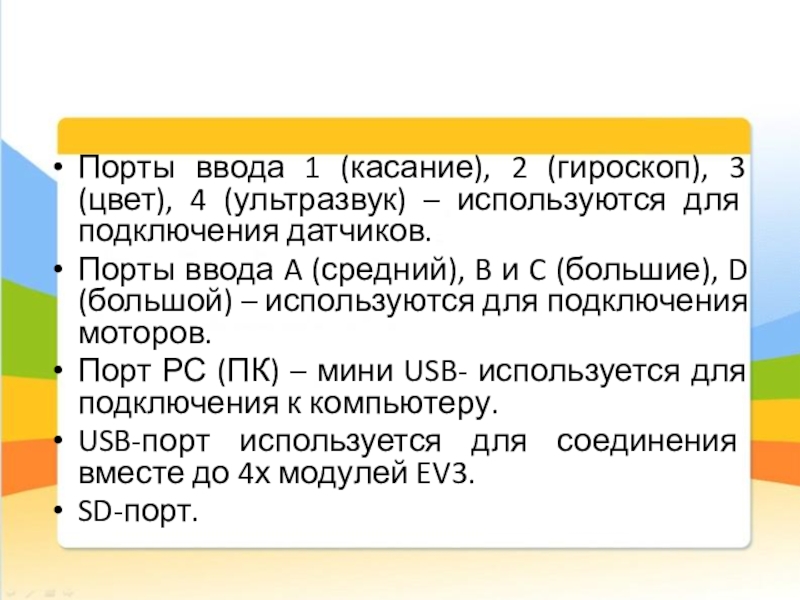 Слайд 11Порты ввода 1 (касание), 2 (гироскоп), 3 (цвет), 4 (ультразвук) –