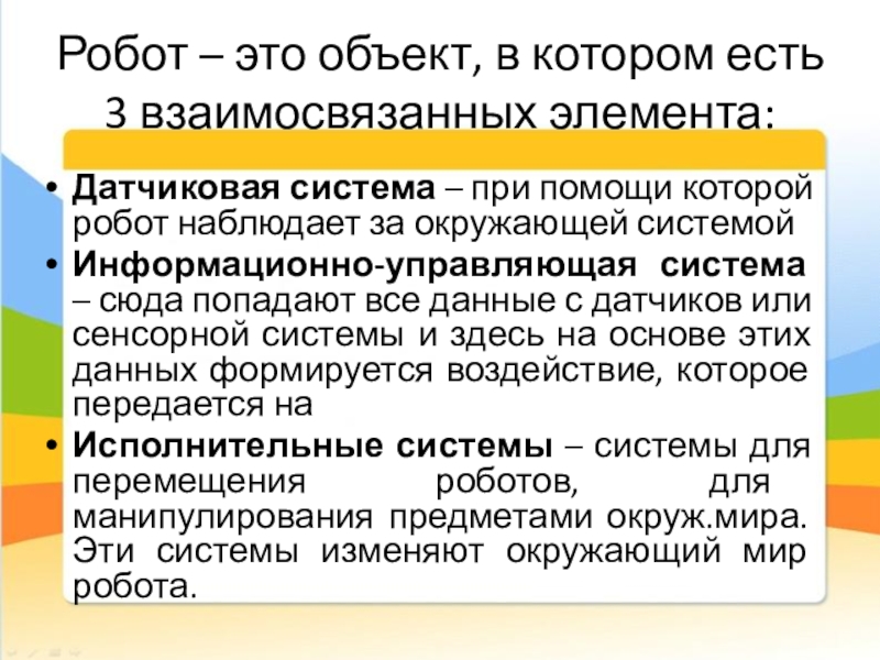 Слайд 2Робот – это объект, в котором есть 3 взаимосвязанных элемента: