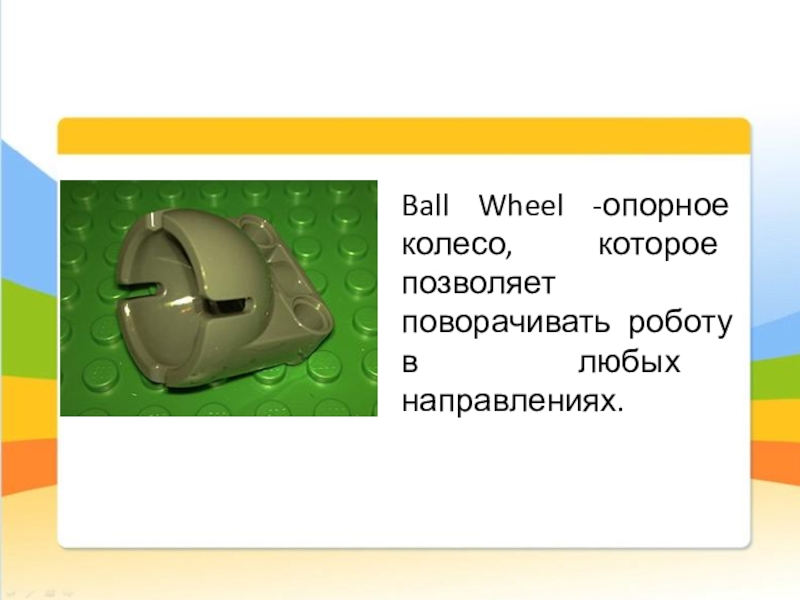 Слайд 7Ball Wheel -опорное колесо, которое позволяет поворачивать роботу в любых направлениях.