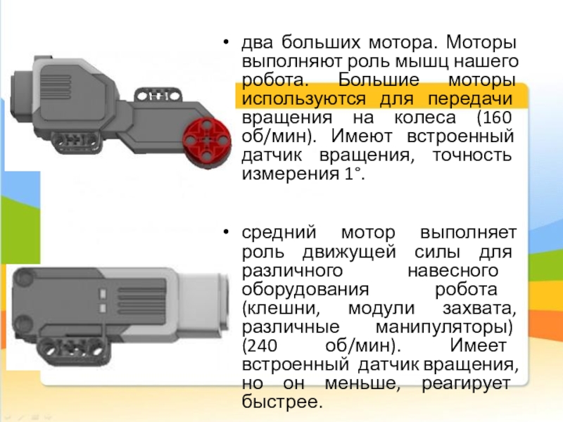 Слайд 8два больших мотора. Моторы выполняют роль мышц нашего робота. Большие моторы