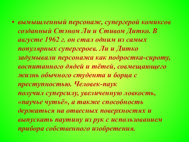 он стал одним из самых популярных супергероев. Ли и Дитко задумывали персонажа как подростка-сироту, воспитанного дядей и тётей, совмещающего жизнь обычного студента и борца с преступностью. Человек-паук получил суперсилу, увеличенную ловкость, «паучье чутьё», а также способность держаться на отвесных поверхностях и выпускать паутину из рук с использованием прибора собственного изобретения.