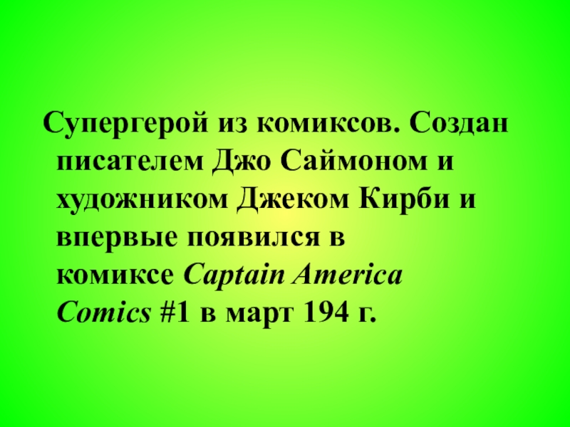 Супергерой из комиксов. Создан писателем Джо Саймоном и художником Джеком Кирби и