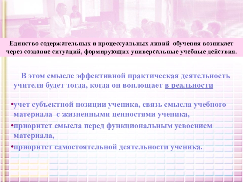 Единство содержательных и процессуальных линий обучения возникает через создание ситуаций, формирующих универсальные учебные действия.