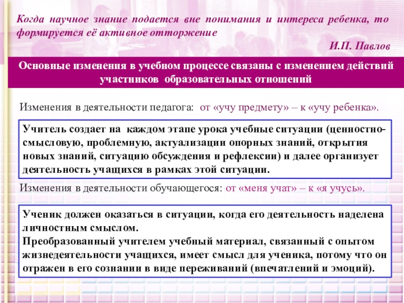 Основные изменения в учебном процессе связаны с изменением действий участников образовательных отношений