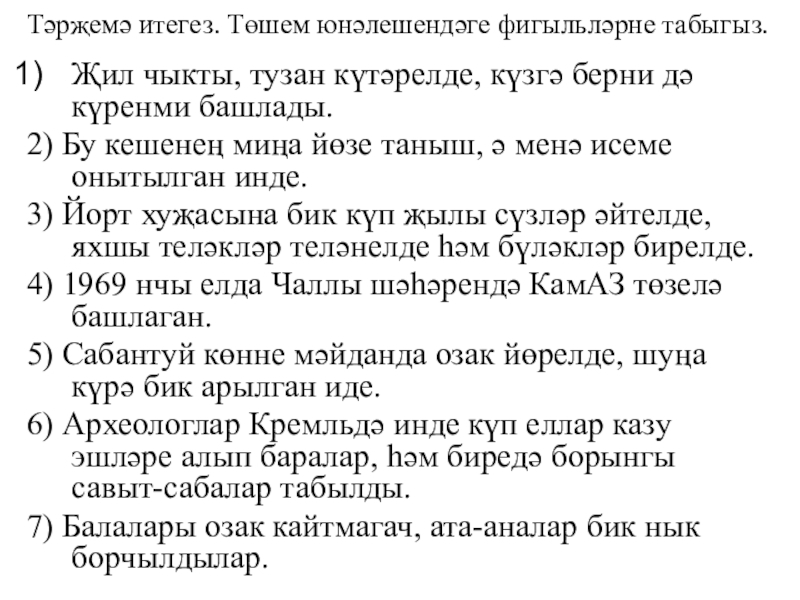 Слайд 7Тәрҗемә итегез. Төшем юнәлешендәге фигыльләрне табыгыз.