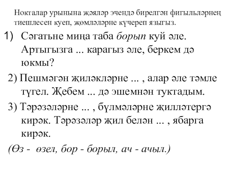 Слайд 9Нокталар урынына җәяләр эчендә бирелгән фигыльләрнең тиешлесен куеп, җөмләләрне күчереп языгыз.