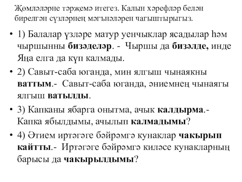 Слайд 8Җөмләләрне тәрҗемә итегез. Калын хәрефләр белән бирелгән сүзләрнең мәгънәләрен чагыштырыгыз.