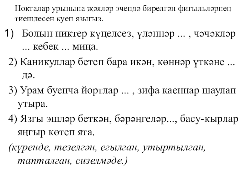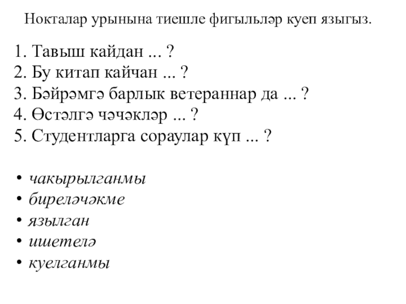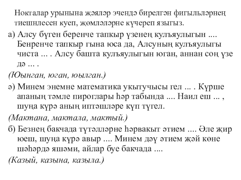 Слайд 5Нокталар урынына тиешле фигыльләр куеп языгыз.