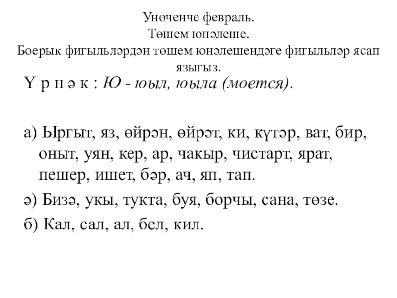 а) Ыргыт, яз, өйрән, өйрәт, ки, күтәр, ват, бир, оныт, уян, кер, ар, чакыр, чистарт, ярат, пешер, ишет, бәр, ач, яп, тап.