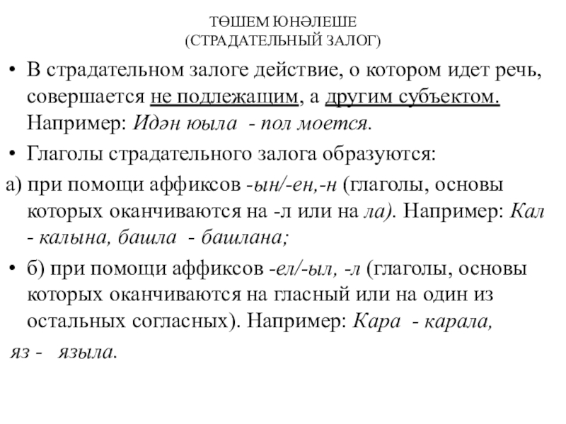а) при помощи аффиксов -ын/-ен,-н (глаголы, основы которых оканчиваются на -л или на ла). Например: Кал - калына, башла - башлана;