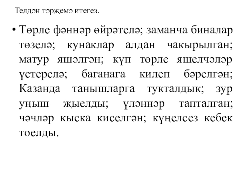 чакырылган; матур яшәлгән; күп төрле яшелчәләр үстерелә; баганага килеп бәрелгән; Казанда танышларга тукталдык; зур уңыш җыелды; үләннәр тапталган; чәчләр кыска киселгән; күңелсез кебек тоелды.