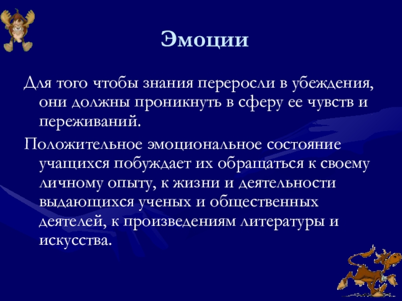 ЭмоцииДля того чтобы знания переросли в убеждения, они должны проникнуть в сферу ее чувств и переживаний.Положительное эмоциональное