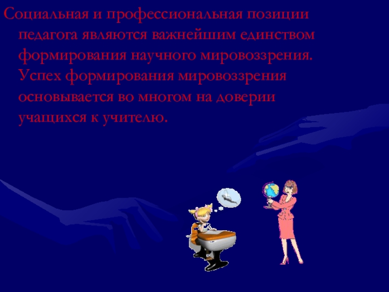 Социальная и профессиональная позиции педагога являются важнейшим единством формирования научного мировоззрения. Успех формирования мировоззрения основывается во многом