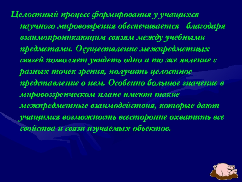 Слайд 10Целостный процесс формирования у учащихся научного мировоззрения обеспечивается благодаря взаимопроникающим
