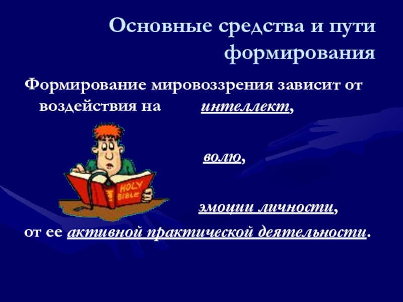 Основные средства и пути формированияФормирование мировоззрения зависит от воздействия на     интеллект,