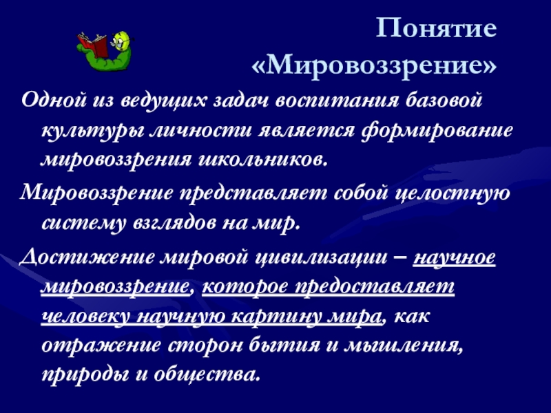 Понятие «Мировоззрение» Одной из ведущих задач воспитания базовой культуры личности является формирование мировоззрения школьников.Мировоззрение представляет собой целостную систему взглядов на мир.Достижение мировой цивилизации – научное мировоззрение, которое предоставляет человеку научную картину мира, как отражение сторон