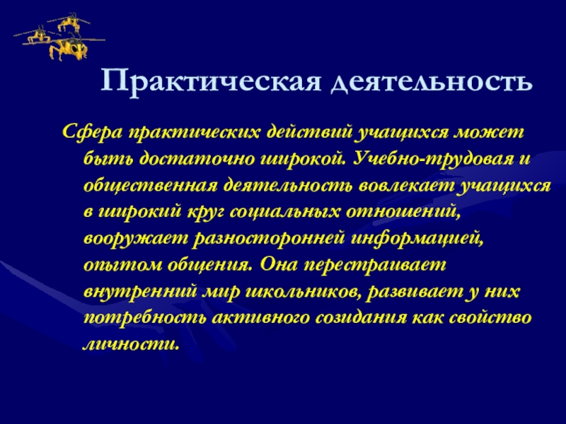 Практическая деятельностьСфера практических действий учащихся может быть достаточно широкой. Учебно-трудовая и общественная деятельность вовлекает учащихся в широкий