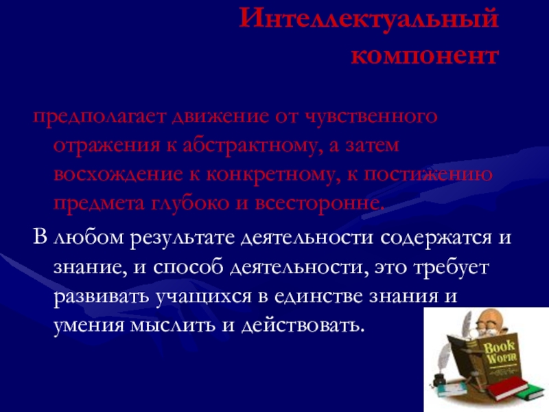 Интеллектуальный компонентпредполагает движение от чувственного отражения к абстрактному, а затем восхождение к конкретному, к постижению предмета глубоко